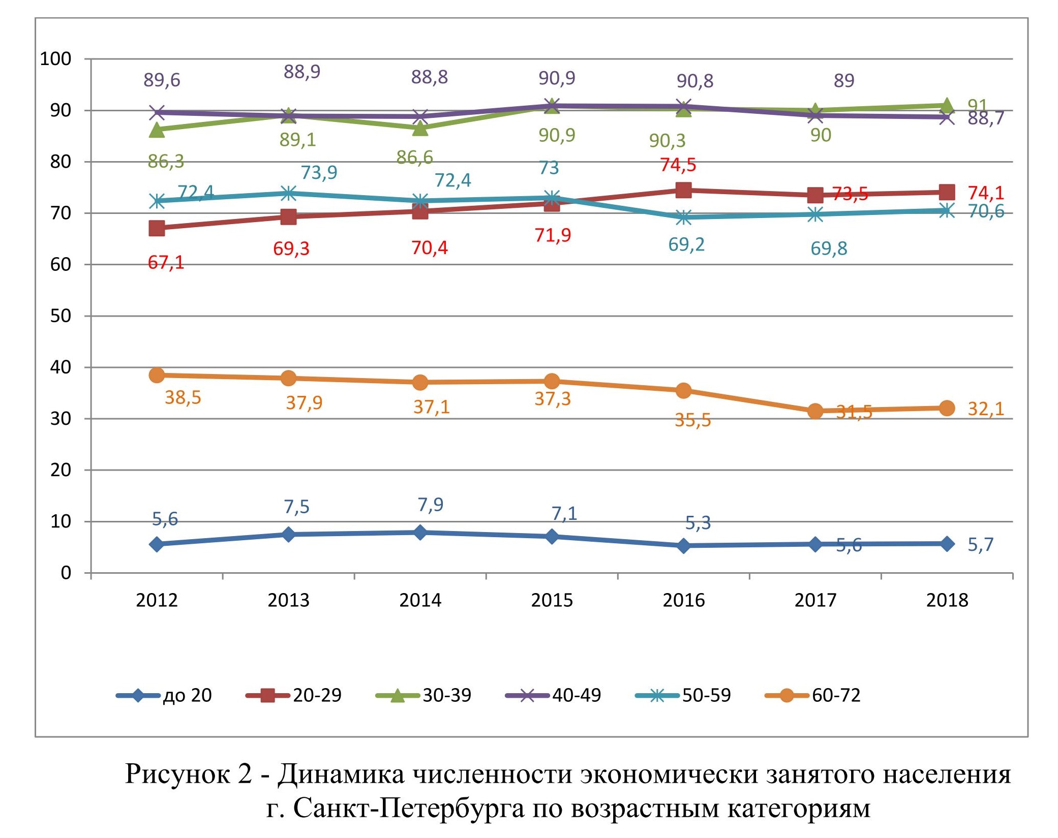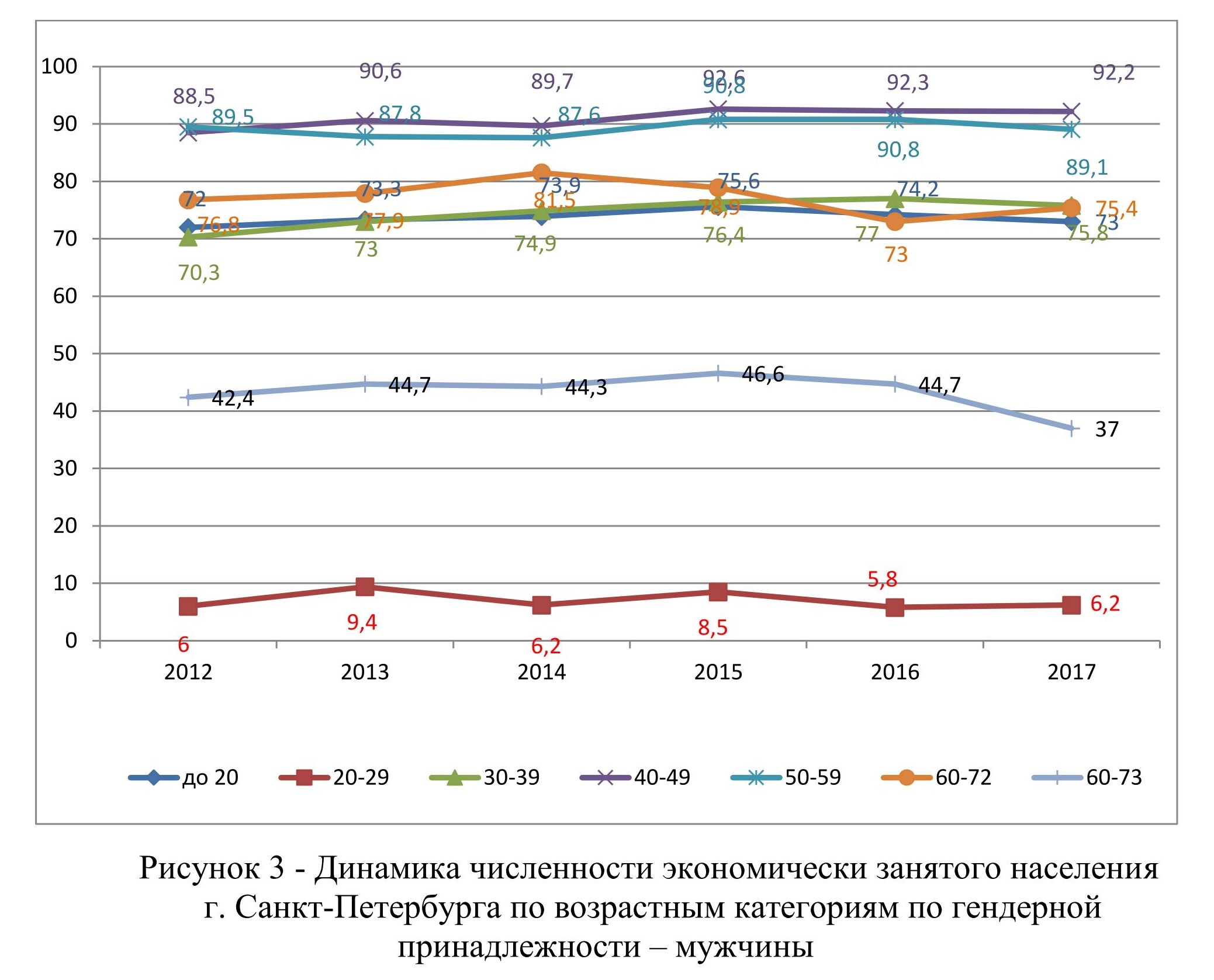 На рисунке 3 представлена динамика численности экономически занятого населения г. Санкт-Петербурга по возрастным категориям по гендерной принадлежности – мужчины.