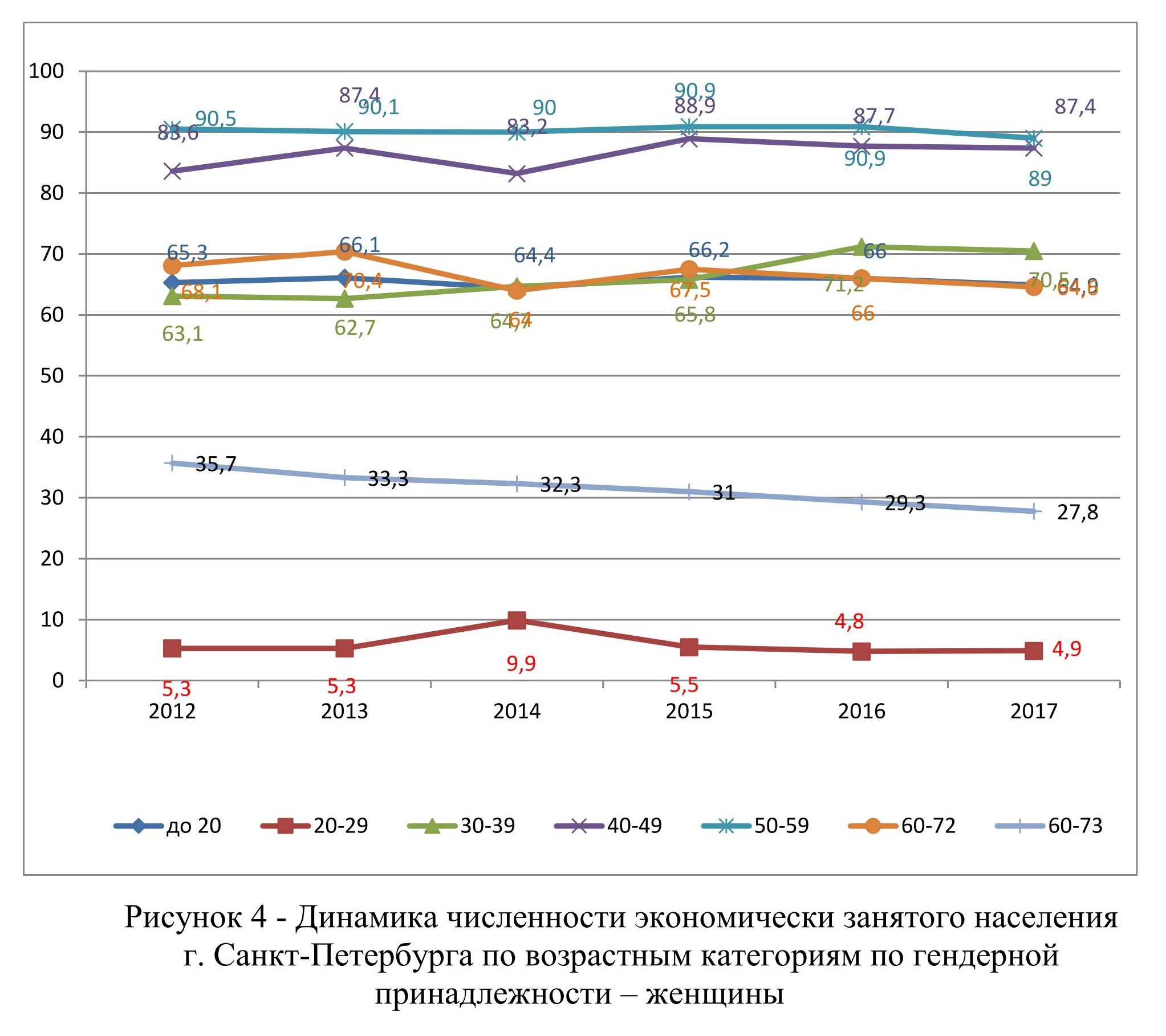 На рисунке 4 представлена динамика численности экономически занятого населения г. Санкт-Петербурга по возрастным категориям по гендерной принадлежности – женщины.