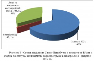 Данный рисунок позволяет увидеть долю занятого населения в городе Санкт-Петербург за декабрь 2018 г. и январь 2019 г., она составила 66%, а доля безработных в данный период составила 42%, также, присутствуют в структуре трудового рынка лица, которые не относятся к выше озвученным двум категориям, но являются рабочей силой – их доля составляет 33%.