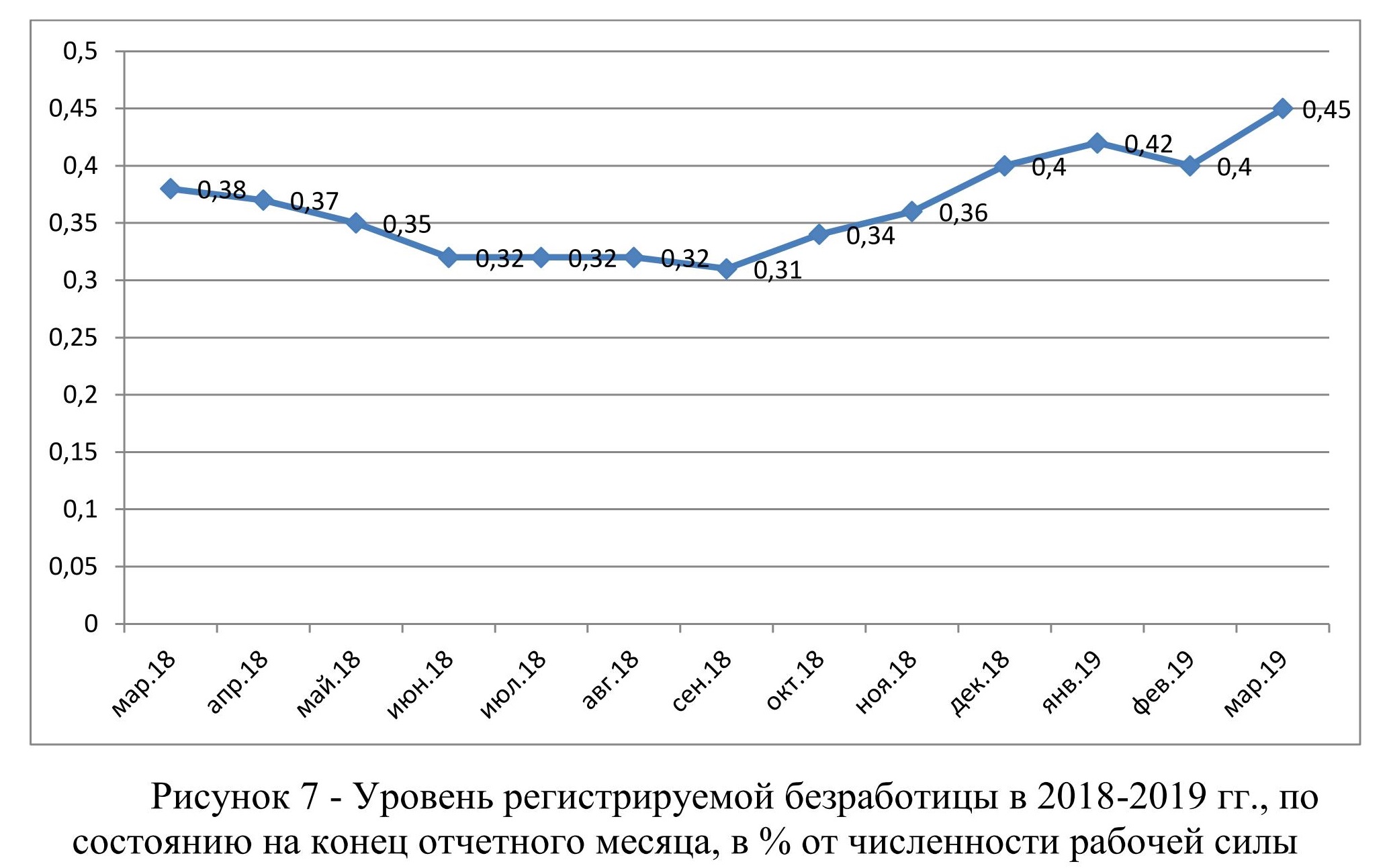 На рисунке 7 представлена динамика уровня зарегистрированной безработицы за период с 2018 по 2019 годы в процентном соотношении к общей численности рабочей силы.