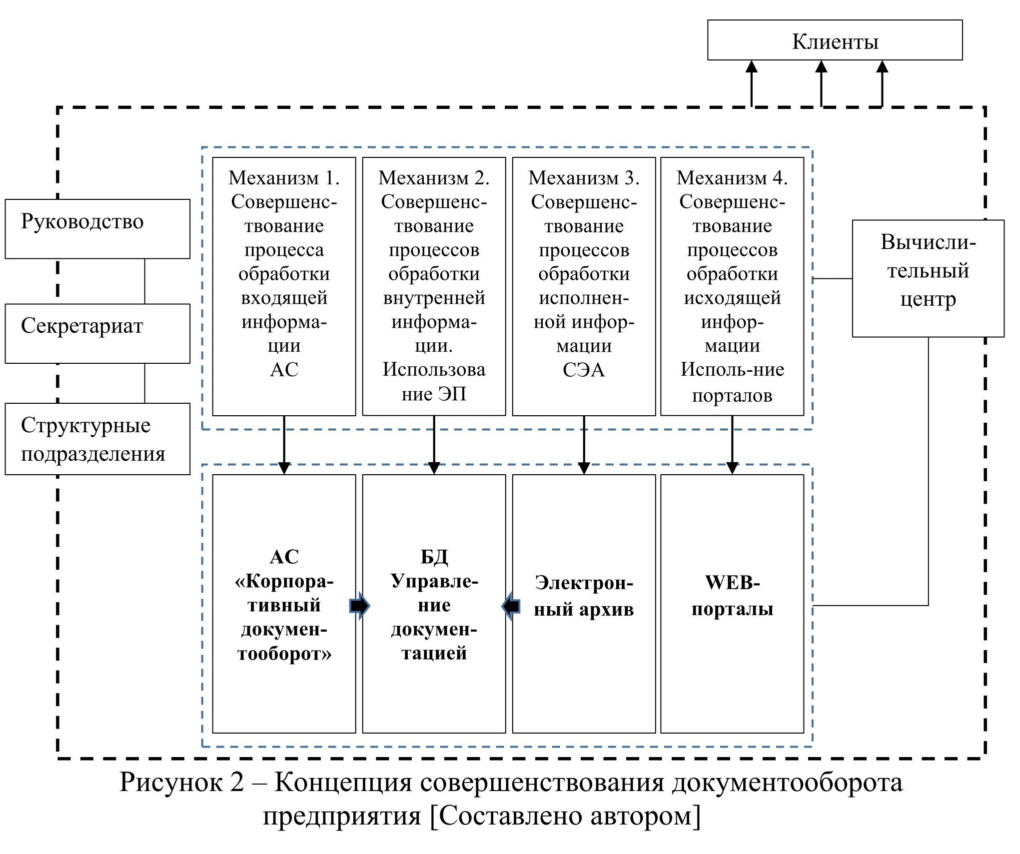 Принимая во внимание тот факт, что процесс развития документооборота сегодня находится в активной стадии, основные составляющие этого процесса имеют много нерешенных проблем и недостатков. С целью улучшения работы предприятия с документами, выработки безопасных механизмов обработки информации, налаживания коммуникации, улучшения системы хранения информации и ее поиска, была разработана следующая концепция совершенствования документооборота. Она представлена в виде схемы на рисунке 2.