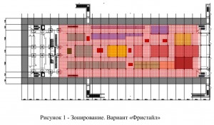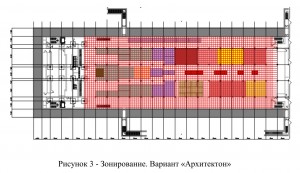 Третий вариант строился на основной теме оформления выставочного пространства: архитектоны, выстроенные из различных материалов. Вариант «Архитектон» имеет общий вид: все павильоны организованы таким способом, чтобы прочитать вид лежащего архитектоны, который начинается с входной зоны. Каждая зона, при возможности, организована цельным блоком. Все пространство разделено на три ряда: центральный ряд представляет образ архитектона, имеет в себе разные разделы, далее идет кураторская программа (рисунок 3).