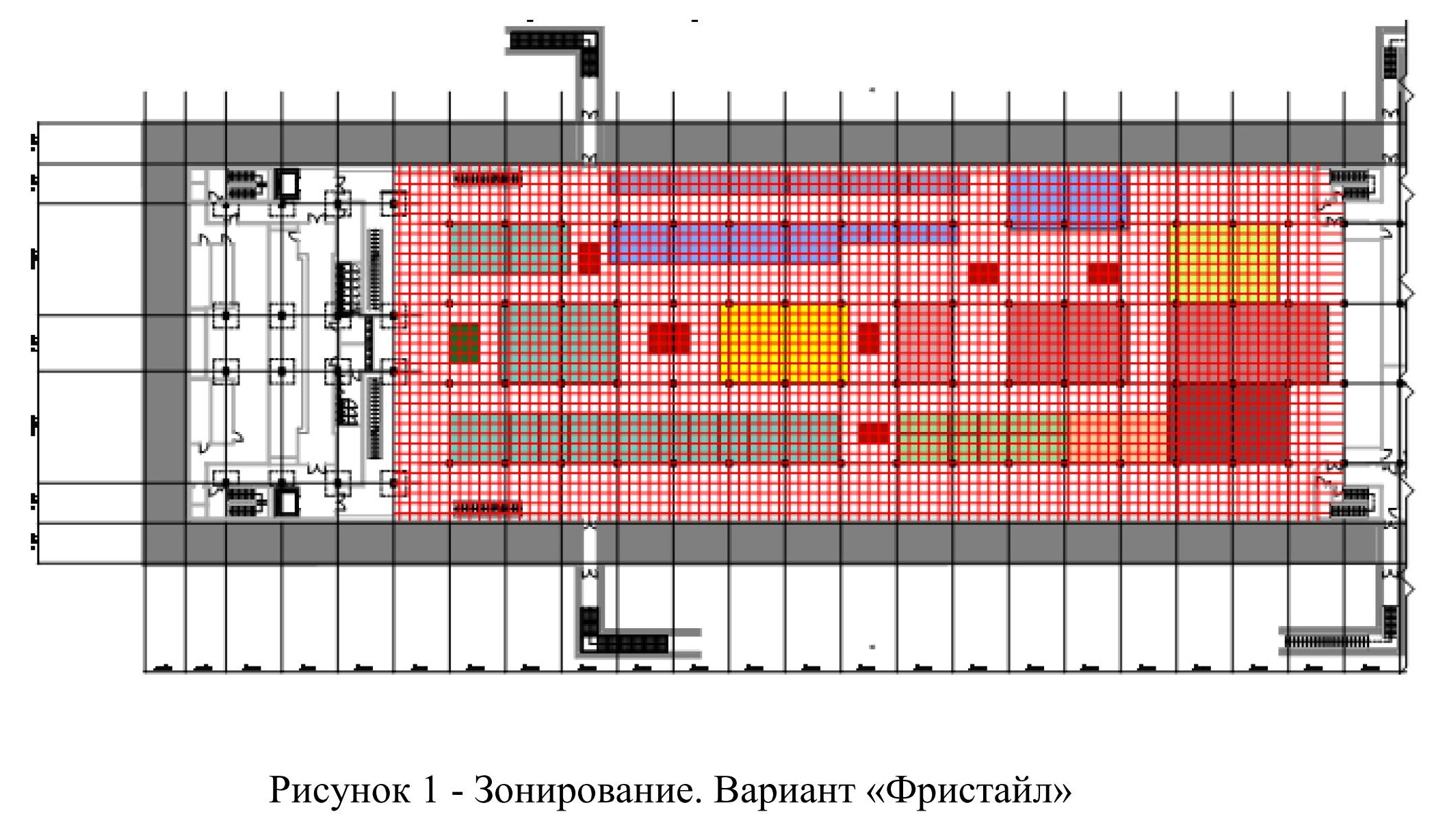 Первый вариант строился на базе правильной организации пространства. «Фристайл» не имеет общего рисунка экспозиции, в отличие от последующих вариантов. Все пространство разделено на четыре ряда (рисунок 1).