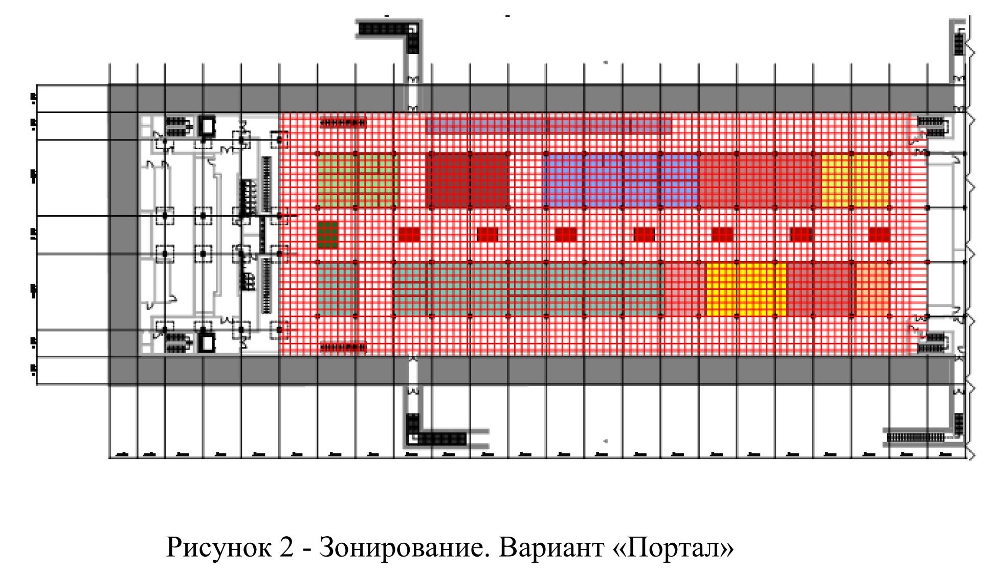 Второй вариант строился на принципе сквозного пространства. Вариант «Портал» имеет общий вид: каждая зона тесно организована, иногда встречаются сквозные проходы между рядами. Все пространство разделено на три ряда: два основных с экспозициями и одним рядом посередине, где расположен ресепшн и вся кураторская программа (рисунок 2).