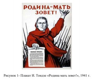 - Военный плакат. Одну из самых важных ролей играл военный плакат. Во время Великой Отечественной войны плакаты распространялись с еще большей скоростью. Они помогали людям выстоять в эти тяжелые времена, давали поддержку и надежду на лучшее. Они защищали Родину! Спустя неделю после начала войны появляется один из самых известных плакатов военных лет «Родина-Мать зовет!» И. Тоидзе (см. рисунок 1). Он был издан миллионными тиражами на всех языках народов.