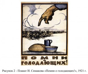 - Тема голода. Часто в социальной рекламе того времени встречалась тема голода. В начале двадцатых годов неурожаи привели к тому, что основная масса населения страны страдала от голода. Правительство решило выпускать плакаты, обращаясь в основном к тем, у кого была еда. На плакате И. Симакова, выпущенном в 1921 г. на фоне толпы людей, страдающих от голода, изображен кусок хлеба с водой и надпись: «Помни о голодающих!» (см. рисунок 2).