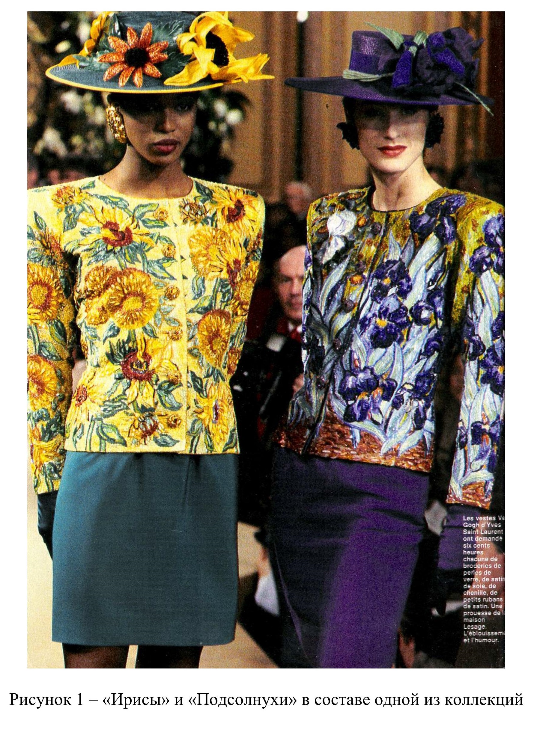 Винсент Ван Гог – один из ярких представителей такого течения в искусстве как постимпрессионизм [3, с. 135]. Как известно, гениальность художник была признана только после его смерти. Великий Ив Сен Лоран, основатель Модного Дома Yves Saint Laurent, первым понял, что моду на Ван Гога надо использовать. В 1988 г. он представил публике коллекцию жакетов с вышитыми подсолнухами и ирисами Винсента Ван Гога.