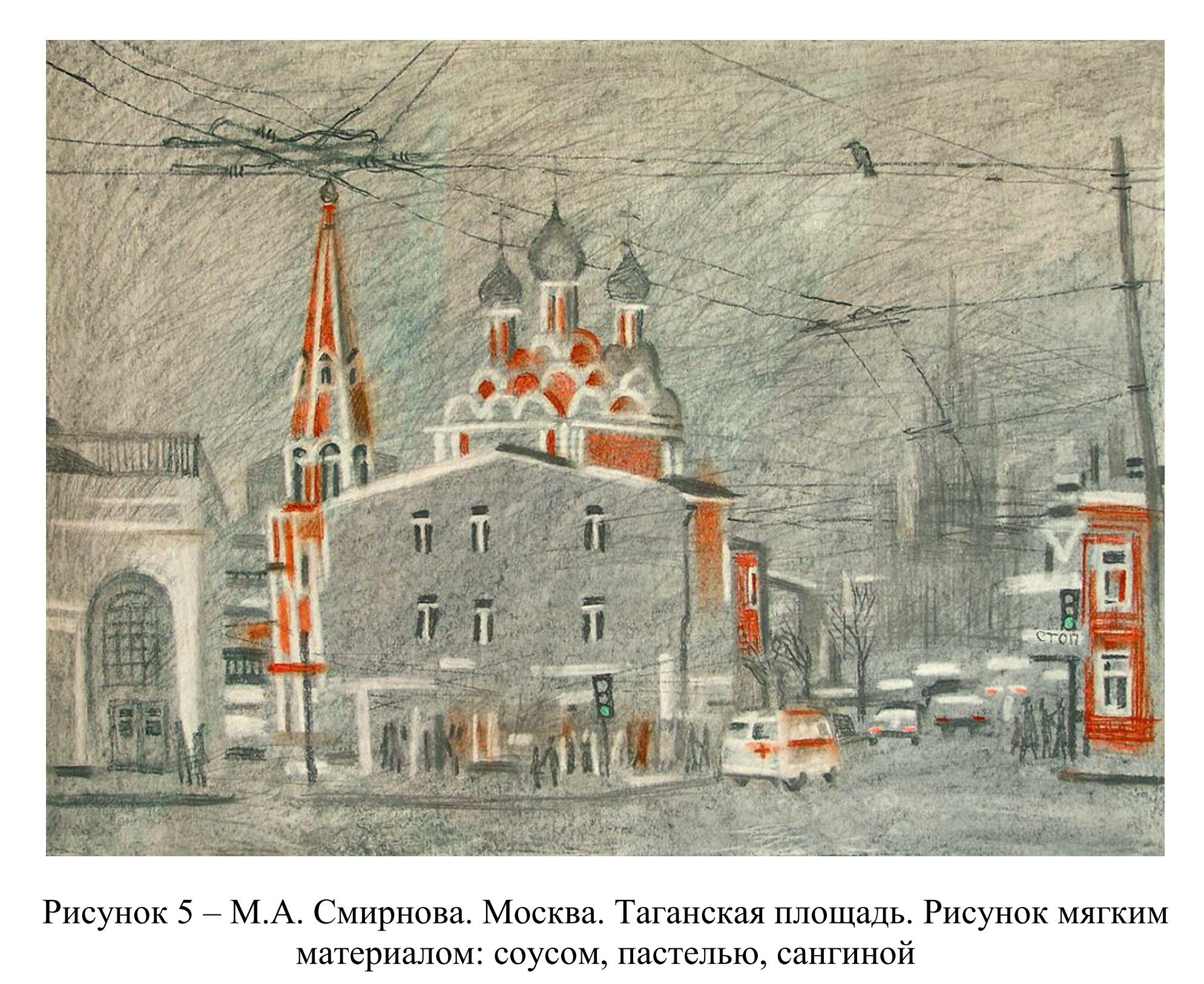 Интересный и тонально богатый вариант исполнения рисунков – рисование с использованием мягких материалов. Этот способ привлекателен широким спектром действий. Обычным углем можно передать тонкие градации светлого и темного, используя прокладку пятен и легкую прорисовку деталей. В мягком материале можно играть не только толщиной линии, степенью нажатия мелка, но и использовать разные оттенки цвета. С помощью кисти руки и пальца можно выполнить растяжку, смешивать цвета, делая их более глубокими. Соус, сангина, уголь, акварельные или восковые мелки, пастель имеют приятную структуру и оставляют красивую шероховатость на поверхности бумаги, что создает определенный лейтмотив. На основе путевых зарисовок при доработке в мастерской профессиональный художник создает целые серии увлекательных путешествий в мир графики (Рис. 5). «Процесс рисования – это процесс познания, это путешествие, в котором узнаешь новое о характерах и жизни изображаемых героев. Человек, рисуя, непроизвольно вникает в события, происходящие в то время. Он начинает лучше понимать характеры и жизнь изображаемых героев. А как иначе? Художник должен понимать, что он пытается изобразить, нарисовать, а в дальнейшем творческом пути – придумать» [4, с. 417]. И это те качества произведения, которые «являются носителями эстетических ценностей, духовной наполненности, жизненности художественных образов» [5, с. 72].