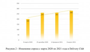 Для выведения закономерности роста на всех рынках представим данные по федеральному и глобальному рынку, в рамках федерального игрока рассмотрим компанию Delivery Club — лидера среди сервиса по доставке готовой еды и отразим результаты на рисунке 2, на котором представлено изменение спроса на готовую еду с марта 2020 г. по март 2021 г., в качестве показателей представлены максимальные значения количества заказов в день (в тыс. штук) [3].