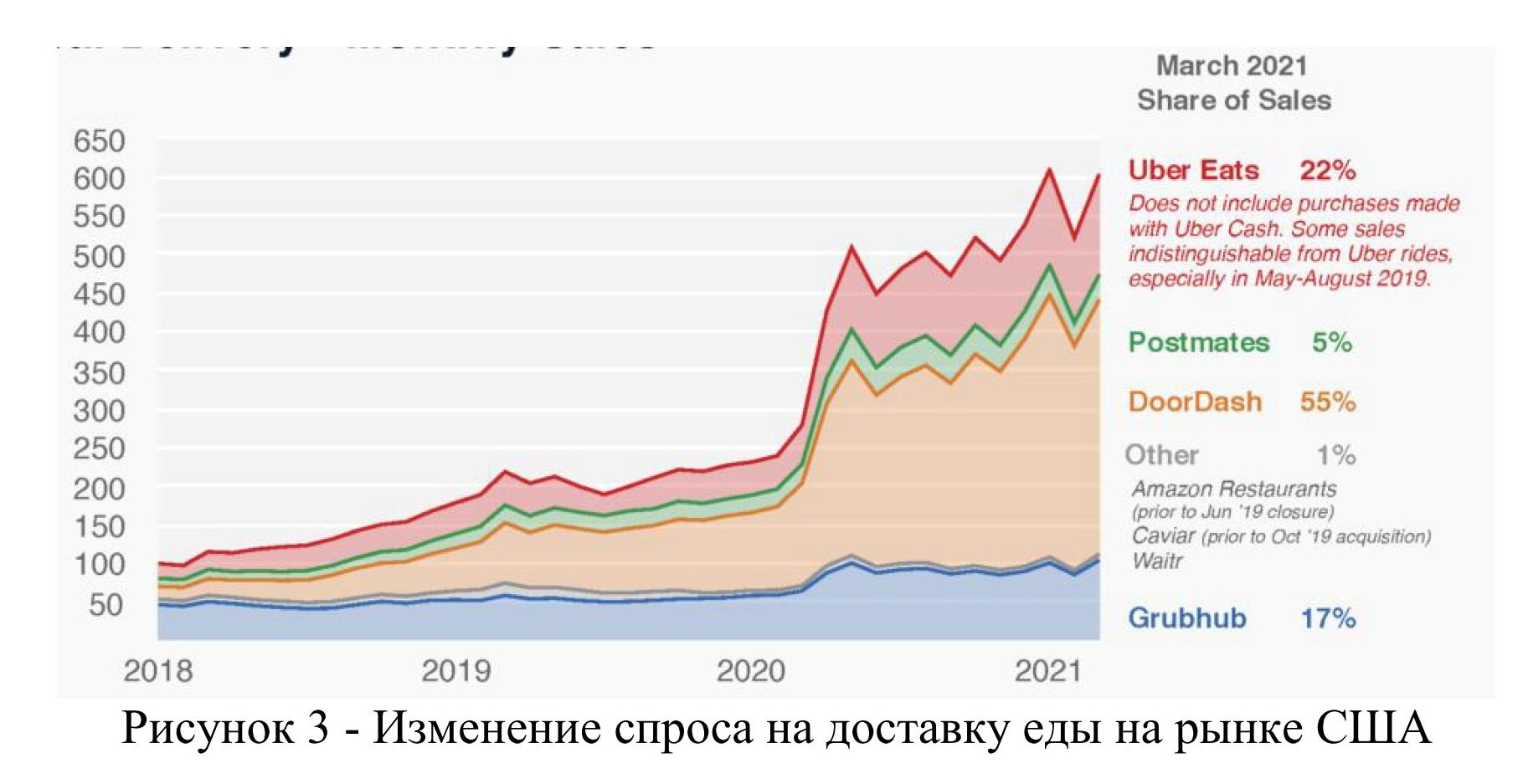 Можно отметить, что ровно за год рост спроса составил 40%. В рамках анализа спроса на глобальном рынке обратим внимание на исследование Bloomberg Second Measure, которое показало рост ежемесячных продаж на рынке доставки готовой еды в США. По данному исследованию можно сделать вывод, что рост спроса прослеживается и на март 2021 г., рисунок 3. В марте 2021 г. продажи услуг по доставке еды в совокупности выросли на 116% по сравнению с аналогичным периодом прошлого года [20].