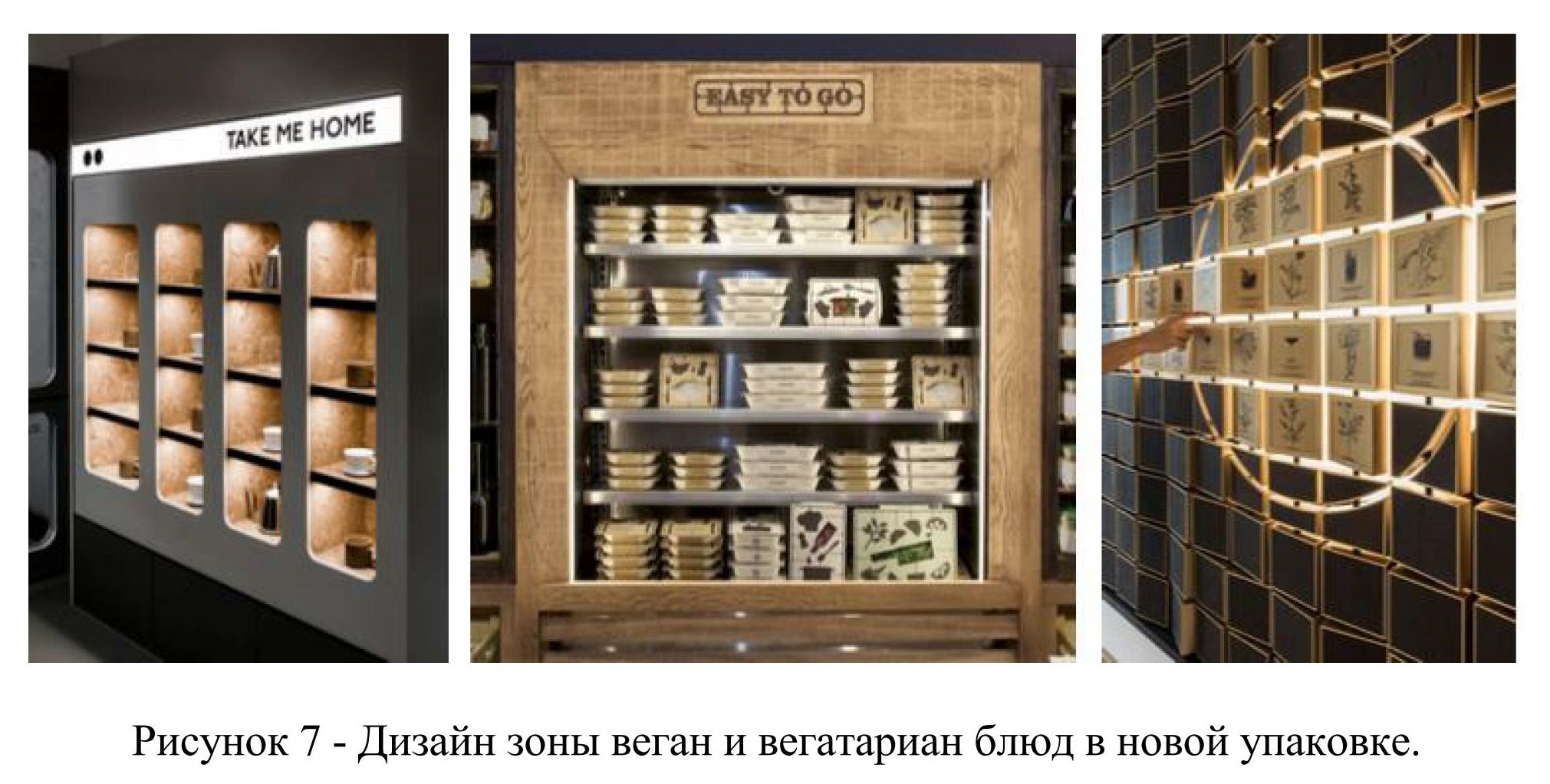 Чтобы блюда не терялись по упаковке и стоимости среди других позиций, средний чек которых 99 рублей, важно выделить зону органик-направления особенным дизайном, который сочетает в себе элементы дерева и современные дизайн-решения, а после чего адаптировать его под стандарты и дизайн магазина. Пример представлен на рисунке 7.