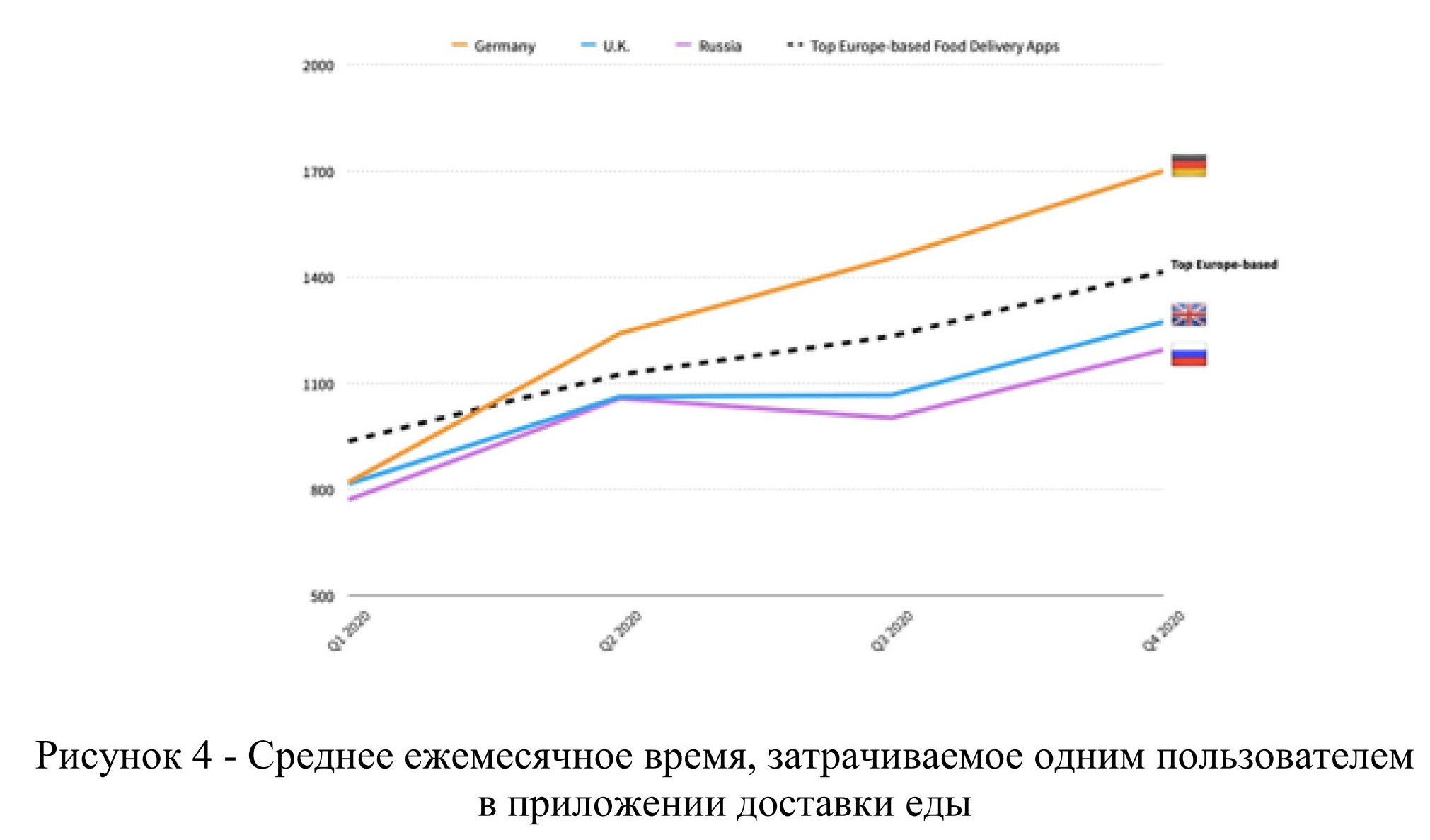 Исследование Sensor Tower [19] отражает поведение пользователей через среднее ежемесячное время, затрачиваемое одним пользователем на приложения доставки еды, рисунок 4. В исследовании было рассмотрено 4 квартала 2020 г.: