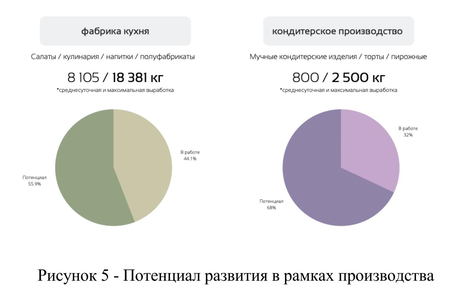 Основными задачами сектора готовой еды для региональной торговой сети являются: отстаивание от конкурентов и федеральных сетей, оперативное реагирование на запросы покупателей, а также формирование привычки покупки готовой еды ресторанного уровня. Как показал анализ потенциала развития в рамках производства, у компании «Киты еды» есть потенциал для увеличения объема производства. Рассмотрим это на рисунке 5: