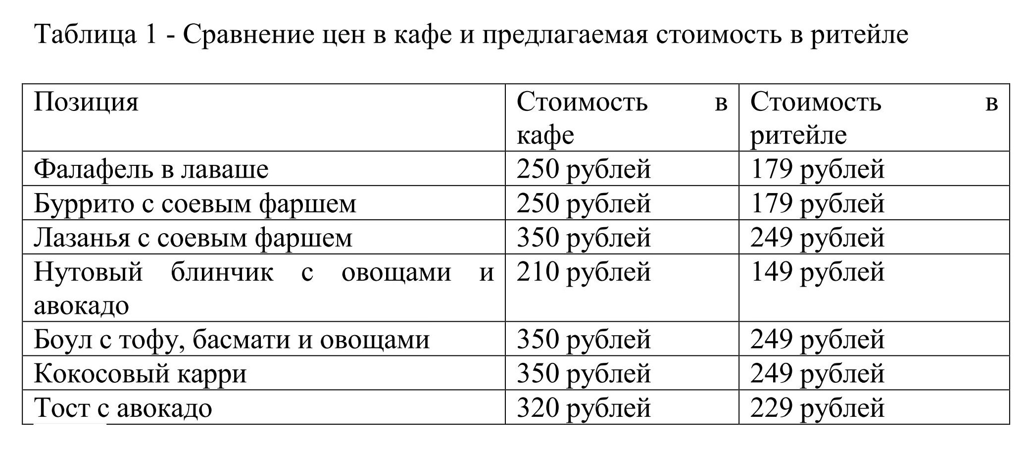 Такой субкатегорией является веганская и вегетарианская еда, поскольку ее присутствие в ассортименте очень низкое — сделаем акцент на увеличение ассортимента. Обратим внимание на позиции, которые выбирают потребители каждый день в кафе, адаптируем их под формат «c собой», сохранив качество, ценность и предложив лучшую стоимость на рынке. Среди расширения ассортимента необходимо обратить внимание на такие позиции как (см. таблицу 1).