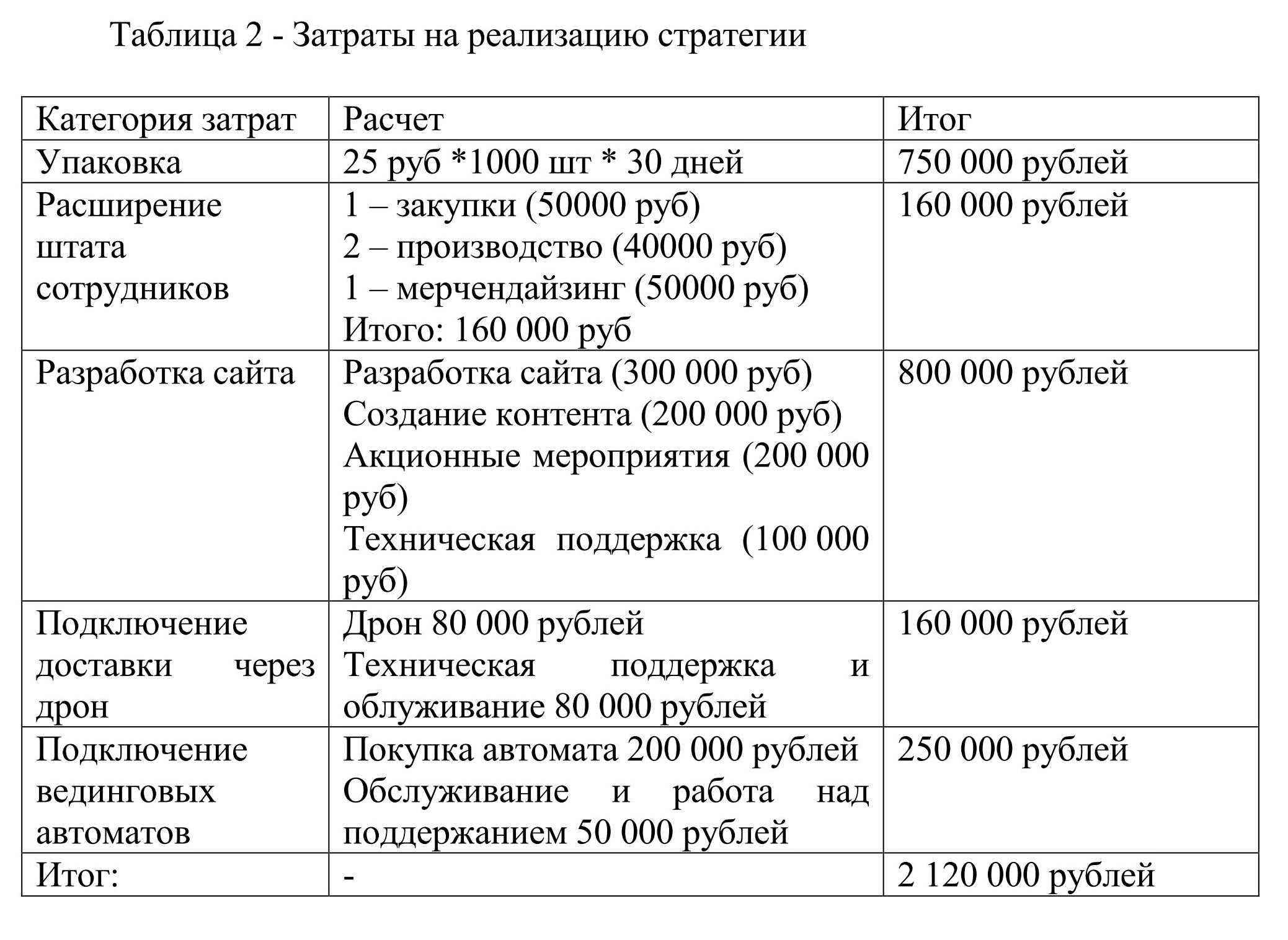 В завершении стратегии необходимо подвести экономический итог — какие затраты понесет реализация данной стратегии. Отразим расчеты в таблице 2. За план продаж возьмем 1000 единиц в день по всем магазинам: