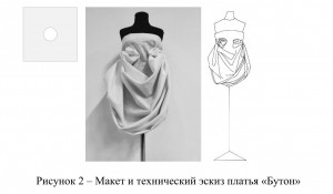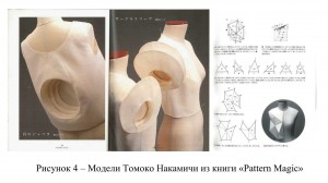 Простота и лаконичность конструкций первоисточника позволяет получать бесчисленное количество вариантов объемных форм [5]. Выполняя задание, учащиеся приобретают опыт образного формообразования, поскольку полученные объемные модели стимулируют зрительные импульсы на выявление аналогов по форме, ритму, масштабу из окружающего мира. Зачастую модели обретают ассоциативные названия, указывающие на характерные признаки общности с прототипом: платье «Бутон», юбка «Лестница», пальто «Кимоно» (рисунок 2).