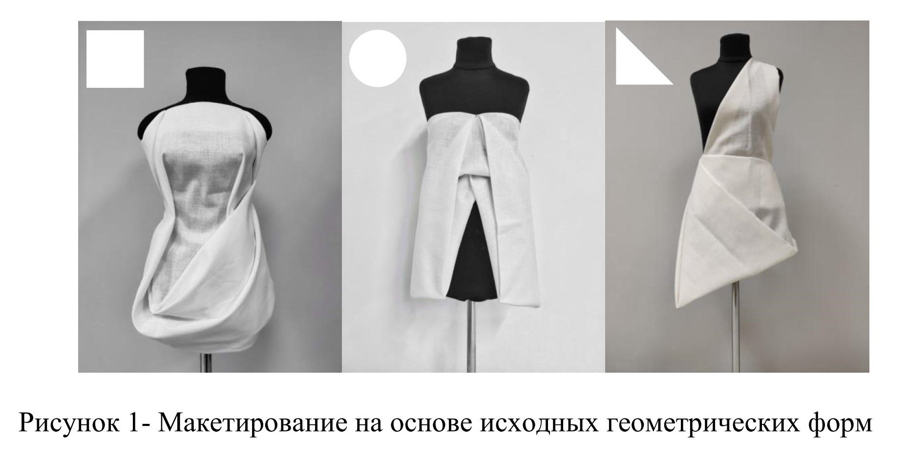 Обучения начальным навыкам работы с объемом ведется «от простого к сложному». Упражнения первого этапа подразумевают разработку серий моделей на масштабном манекене с исходным элементом в виде простых геометрических фигур: квадрат, круг, треугольник (рисунок 1).