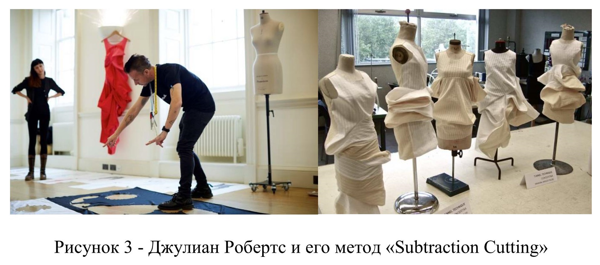 Джулиан Робертс - британский дизайнер, преподаватель Королевского колледжа искусств в Лондоне (Royal College of Art). Уже более 20 лет Джулиан Робертс использует в образовательном процессе свой собственный метод изготовления одежды «Subtraction Cutting» или «Free cutting», то есть «Свободный крой методом вычитания». Метод позволяет получать объемные 3D композиции из максимально простых и абстрактных плоских конструкций. Материал исходного элемента разрезается по конструктивным линиям, в нём прорезаются отверстия, полученный крой скручивают, выворачивают, к ним добавляют отдельные фрагменты. Потенциал для создания разнообразных 3D моделей, которые могут возникнуть благодаря этому методу, бесконечен. Техника «Subtraction Cutting» развивает свободное образно-пространственное мышление, содержит элементы эксперимента и импровизации. Таким экспериментальным приемом конструирования одежды Джулиан делится со студентами по всему миру, проводя открытые лекции и практические воркшопы с демонстрацией метода «Free cutting». Информацию об авторской методике Джулиан Робертс размещает в своем блоге julianand.com [9].