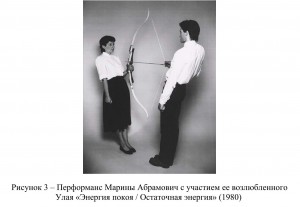 «Энергия покоя». Натянув тетиву лука, Улай целился отравленной стрелой в самое сердце возлюбленной на протяжении нескольких минут, при этом Марина держала основную сторону лука (рисунок 3). Также к телам художников были прикреплены микрофоны, которые записывали их биение сердец. Этот перформанс заключал в себе идею о безграничном доверии в отношениях двух любящих друг друга людей и дался он действительно нелегко.