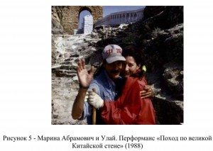 «Поход по великой Китайской стене» поставил точку в их отношениях. Концепт грандиозного перформанса заключался в том, чтобы идти друг к другу с разных концов китайской стены, чтобы попрощаться навсегда. Улай начал свой путь из пустыни Гоби, а Марина с берега желтого моря. Три месяца они шли навстречу друг к другу, преодолев по 2500 километров, чтобы в конце распрощаться (рисунок 5). Этот поход стал действительно грандиозным и вдохновил множество людей.