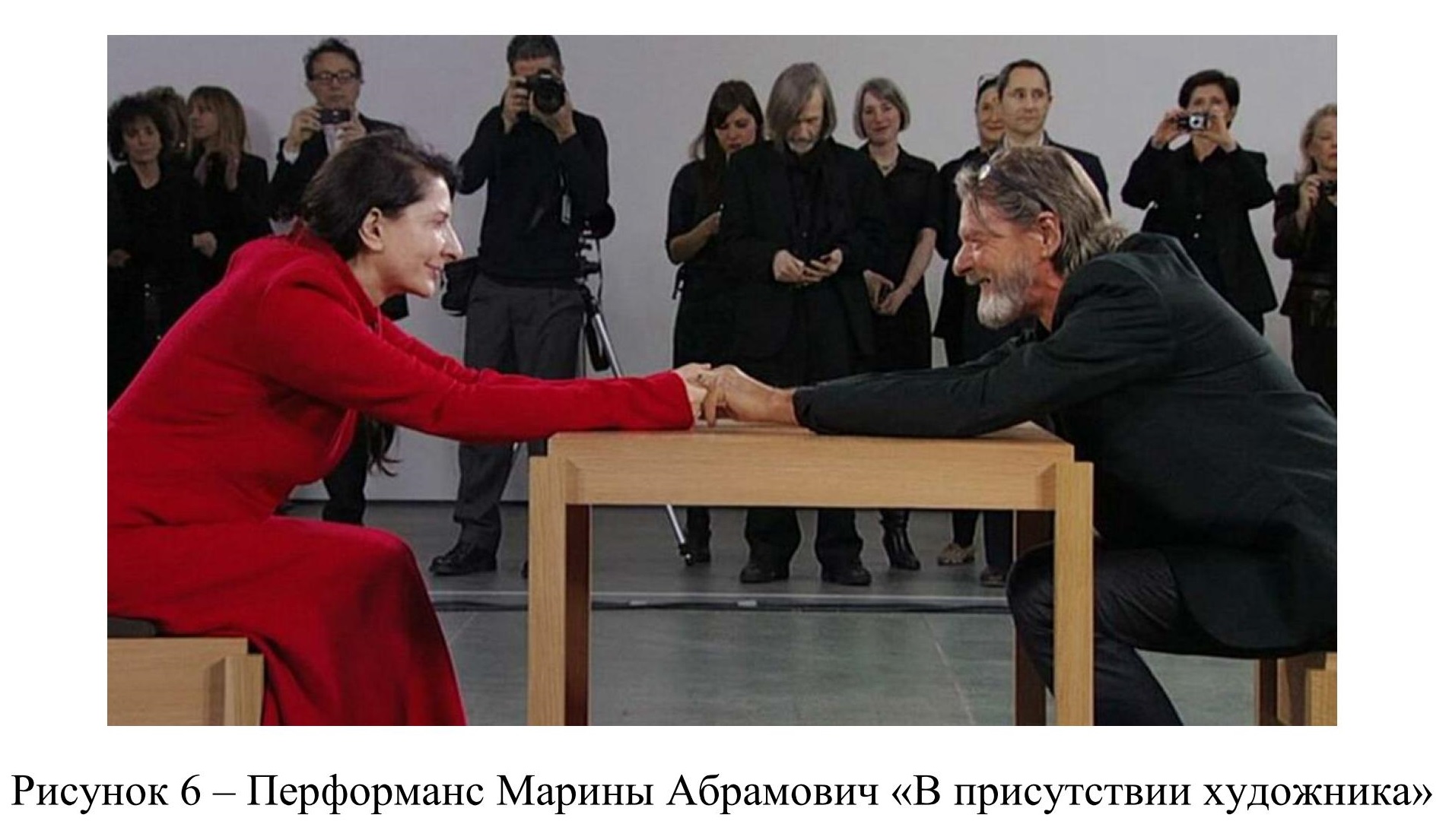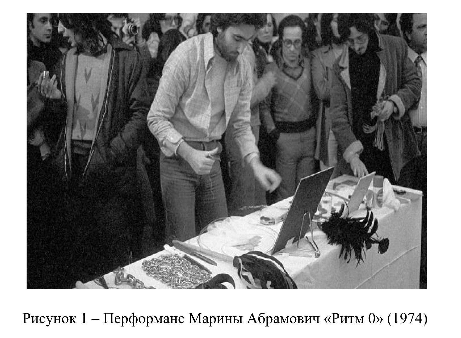 В данной статье по большей части мы будем опираться на анализ работ Марины Абрамович, поэтому хотелось выделить ее собственные слова о том, что же является перформансом: «Перформанс — это умственная и физическая конструкция, созданная вами в специальном месте и в специальное время перед аудиторией. И в момент, когда вы вступаете внутрь этой конструкции, начинается перформанс. Дальше может произойти все что угодно, и все что случится — часть произведения. Для перформанса особое значение имеет стопроцентная включённость, очень важно находиться в нем полностью телом и душой. То же касается зрителей — они должны на сто процентов телом и душой быть в нем... И задача художника — создать такой образ, такую энергетическую связь, которая не даст вам выбора, не позволит не быть «здесь и сейчас», в этом пространстве, с человеком, который обращается к вам, и тогда в вашем сознании больше ничего не остается — только «здесь и сейчас» [4]. Таким образом, можно сделать вывод, что перформанс всегда будет завязан на контакте художника и зрителя, совершенно точно пробудит в нем эмоцию, закрепив этим человека в состоянии «здесь и сейчас», несмотря на то, позитивная это будет эмоция или негативная, хотел от нее избавиться человек или не хотел.