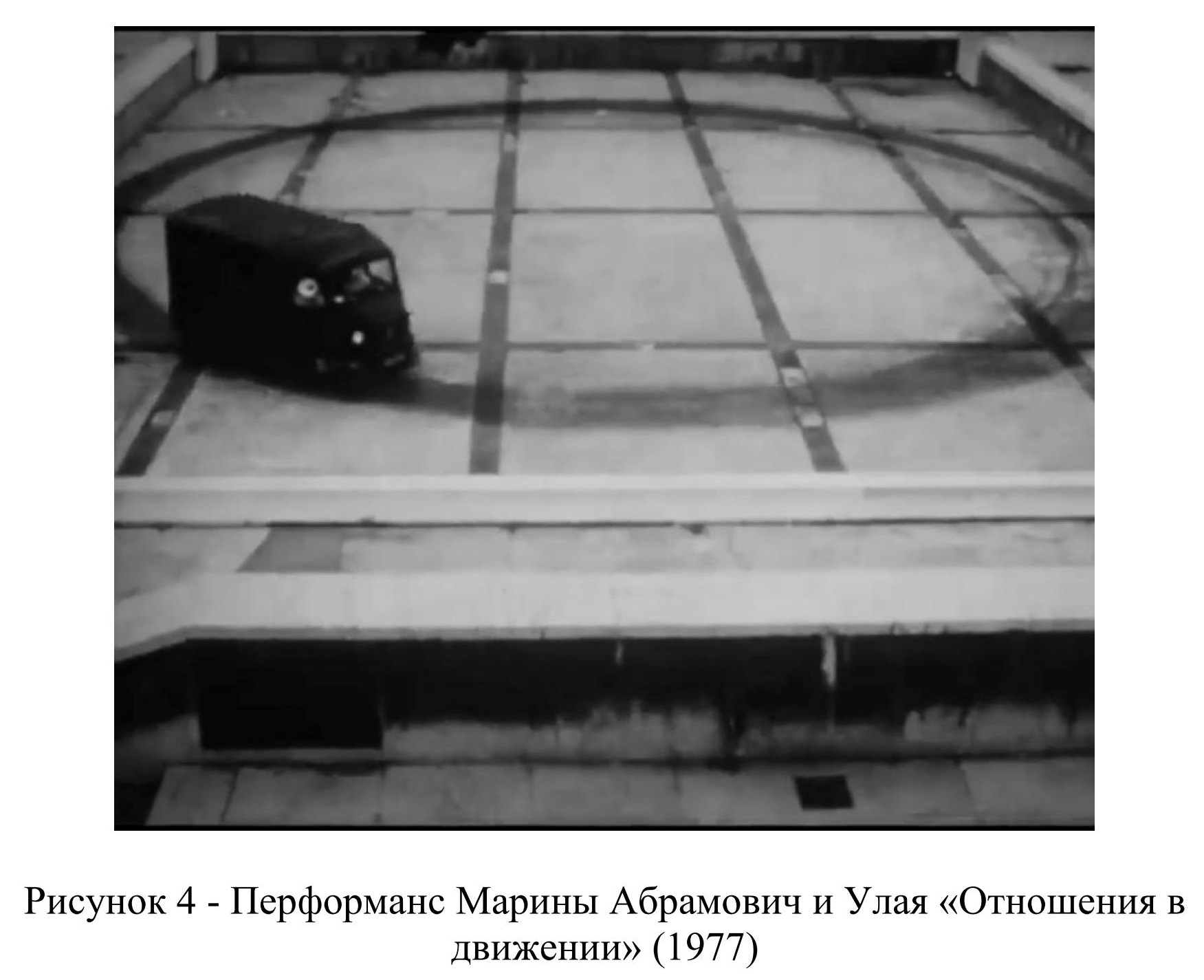 «Отношения в движении». На Парижской биеннале Марина и Улай провели перформанс, задействуя фургон, в котором они жили. 16 часов, вплоть до полного сгорания мотора, Улай кругами водил машину по небольшому мраморному бассейну, глубиной в метр, в то время как Абрамович кричала в мегафон порядковый номер круга, который они проезжали (рисунок 4). От горячего масла на дне бассейна остался сильный черный след, который оставался на том месте еще 10 лет. Идея данного перформанса состояла в том, что художники включили в него весь свой дом, собаку и самих себя, проверив, кто выносливее, машина или же они.