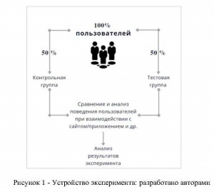 Если рассматривать устройство эксперимента (см. рисунок 1), то 100% трафика сайта рандомно разделяется равномерно на две или более групп (в зависимости от количества сравниваемых версий сайта).