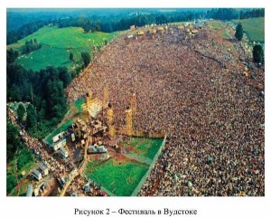За ним последовал, проведенный на молочной ферме в Вефиле, штат Нью-Йорк, Вудстокский фестиваль 1969 г. (рисунок 2), который назывался «Водная экспозиция» и был ознаменован так называемой Эрой Водолея - это астрологическая эпоха, которая предположительно должна была начаться в 1960-х годах. Этот термин и концепция, вероятно, получили толчок в популярной культуре благодаря их использованию на данном фестивале. Фестиваль положил начало «Лету любви» и укрепил мощное общественное движение.
