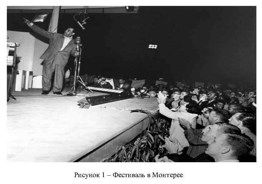 Таким примером может служить поп-фестиваль в Монтерее, который в 1967 г. ознаменовал первый фестиваль в США, который совпал с атмосферой той эпохи и был ей созвучен. Более того, он стал образцом того, что современные музыкальные фестивали должны воплощать в себе. Количество посетителей этого фестиваля варьировалась от 25 000 до 90 000 человек (рисунок 1).