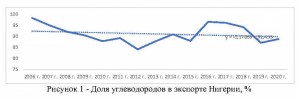 По наблюдениям ученых, «наблюдавшийся в 2000-е гг. значительный экономический рост во многих странах Африки южнее Сахары … приходился в основном на добывающие отрасли промышленности…» [5]. Так, в 2001 г. экспорт Нигерии на 99,66% состоял из углеводородов; в 2006 г. их доля составила 98,24% [6].