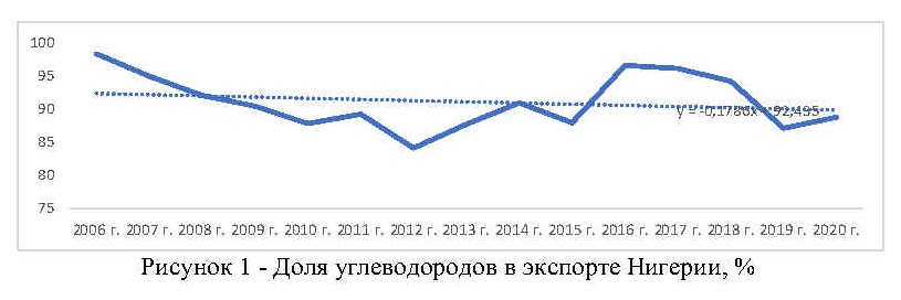 Abstract. According to the simple trading models of A. Smith, D. Ricardo, E. Heckscher and B. Ohlin, a country should specialize in industries in which it has a comparative advantage. A country endowed with abundant natural resources would be better off specializing in them. However, if a country's exports are based on the sale of one or a small number of products, then the country may face the paradox of so-called "ruining growth". After gaining independence over 60 years ago, many countries in Africa fell into addiction, called the “Dutch economic disease”. Over the years, over 90% of Nigeria's exports consisted of oil and gas, but since 2006, the share of hydrocarbons in the country's total sales began to gradually decrease. The share of oil is gradually decreasing due to the increase in sales of agricultural products. The main scientific result: it is proved that Nigeria began to "dilute" its exports with oilseeds and products from them, cocoa, animal skins, etc. However, the pace of export diversification is extremely low, and the country's economy is still highly dependent on hydrocarbon prices.