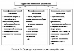 Трудовой потенциал каждого работника формируется под воздействием следующих качеств: умение трудиться и желание работать, проявление инициативы в рабочей атмосфере и творческая активность и другое. На наш взгляд, эффективность вовлечения сотрудников в достижение целей компании зависит от уровня согласованности смыслов и содержания характеристик, которыми мы наполняем трудового потенциала. Трудовой потенциал работника полностью зависит от его степени взаимного согласования в развитии психофизиологического (здоровья), квалификационного (IQ и профессиональные знания) и личного (эмоциональный интеллект) потенциалов. Смысловые контексты нашего видения представлены ниже на рисунке 1.