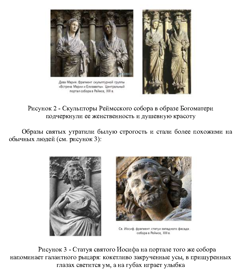 - островерхие соборы со стрельчатыми сводами, обилием арок, витражных окон и галерей. Образец готического стиля в архитектуре (см. рисунок 1). В скульптуре готики приходит новое понимание образов Христа и Богоматери – Христос из грозного судьи превращается в мудрого проповедника (см. рисунок 2).