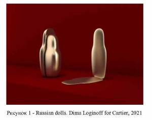 Один из самых известных промышленных дизайнеров России, Дима Логинов, давно строит карьеру, сотрудничая с западными компаниями. За последние пять лет он принял участие в 24 выставках по всему миру: Италии, Франции, США, ОАЭ, Китае, России. Анонс следующей экспозиции в Париже уже размещен на персональном сайте дизайнера. Среди лучших работ - четыре вариации матрешки: принт на плитке, подвесные светильники для двух итальянских фабрик и миниатюрные скульптуры для интерьеров бутиков Cartier (рисунок 1). Хотя Дима Логинов заявляет, «что современный дизайн сегодня не нуждается в особых символах, ассоциируемых с какой-то страной». Это не мешает дизайнеру раз за разом обращаться к шаблонным русским мотивам для европейских заказчиков.