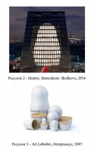 У людей нет веры в российский дизайн: покупатель готов платить больше только за продукт зарубежного производства. Вот и получается, что единственный выход для дизайнера - законспирировать свои детища под европейские. Каждый уважающий себя проектировщик, мечтательно вглядываясь в западные горизонты и строя грандиозные планы по побегу из недружелюбной для дизайна страны, начисто изживает из себя все русское вплоть до имени и фамилии. Остается только одна черта, к сожалению, неискоренимая: при невольном обращении к национальному возникает лишь один образ матрешки, бесконечно интерпретируемый многими ювелирами, дизайнерами и архитекторами в размерах от наперстка и заканчивая многофункциональными бизнес-центрами (рисунок 3).