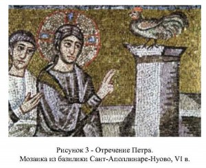 В связи с нашей темой также интересна иконография отречения Петра. На мозаике из Сант-Аполлинаре-Нуово середины VI века мы видим изображение Петра, Иисуса и столпа с петухом (рисунок 3). В вышедшей в 1939 г. работе Стерлинга Каллисена «Иконография петуха на столпе» прослеживается связь между петухом на изображениях сцен отречения Петра и языческими его корнями [8].