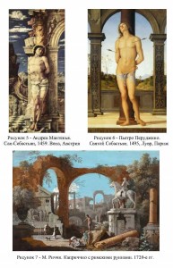 Например, на картинах Пьетро Перуджино и Андреа Мантеньи мы видим Святого Себастьяна, римского воина, привязанным к колонне с капителью, пронзенного стрелами из луков за приверженность христианству (рисунки 5, 6). В обоих полотнах итальянских художников XV века на заднем плане мы видим красивые резные колонны и фрагменты античной архитектуры, сломанные арки.
