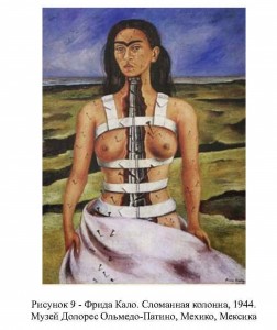 В начале ХХ в. художники-сюрреалисты в своих произведениях часто использовали изображения частей античных сооружений. Ярким примером является картина мексиканской художницы Фриды Кало «Сломанная колонна». Она была написана после перенесенной художницей операции на позвоночнике. Боль и страдания ее тела в результате дорожной аварии и длительного лечения не сломили дух этой хрупкой женщины. Это автопортрет художницы с разверзшейся грудной клеткой, где на месте позвоночника изображена крошащаяся ионическая колонна (рисунок 9).