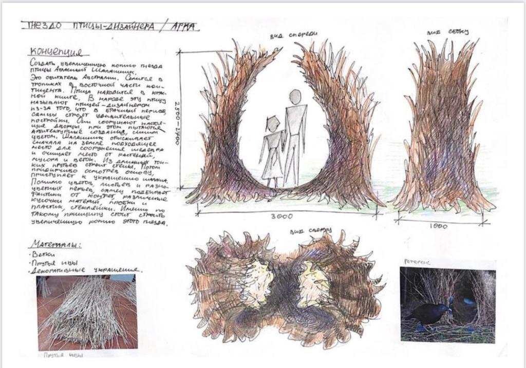 Концепция проекта заключалась в создании увеличенной копии гнезда птицы-шалашника. Это обитатель тропиков в восточной части Австралии. Тематика студенческого проекта привлекает внимание к птице, занесенной красную книгу, и соответствует цели «Крылатых соседей» – защите пернатых.