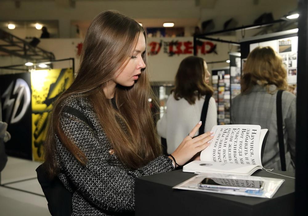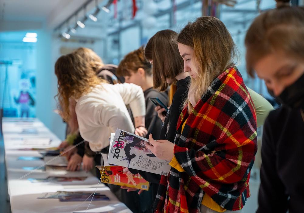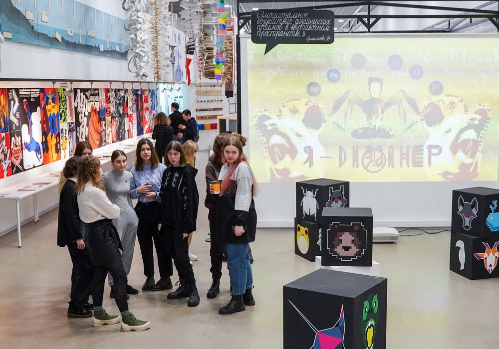 Каждый желающий мог сделать памятные фото не только на фоне множества ярких работ, но и с экспозицией первокурсников – в первом семестре студенты разными графическими приемами разработали знаки животных, которые украсили один из выставочных залов института.