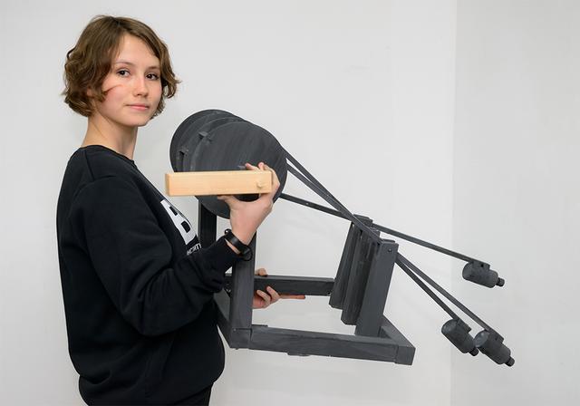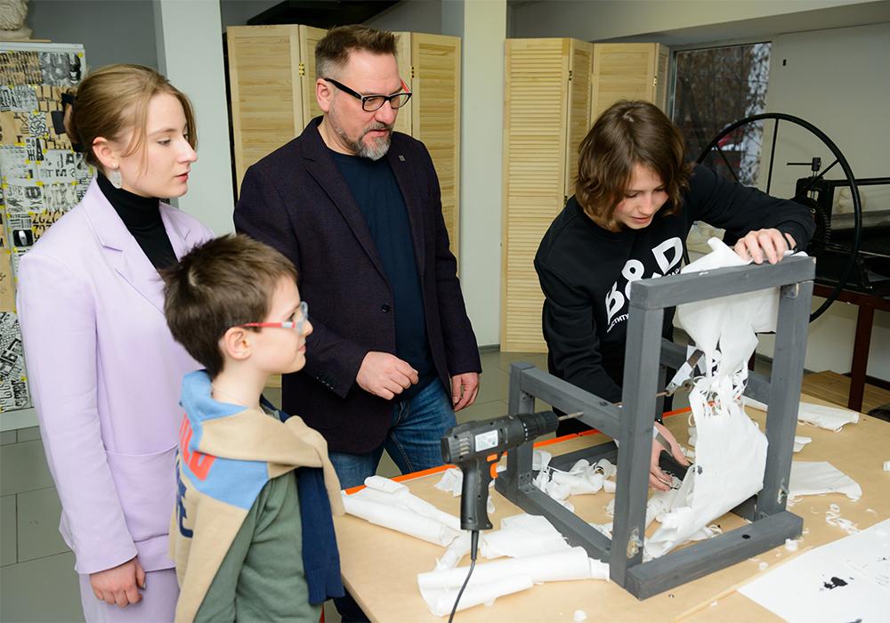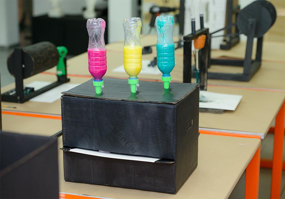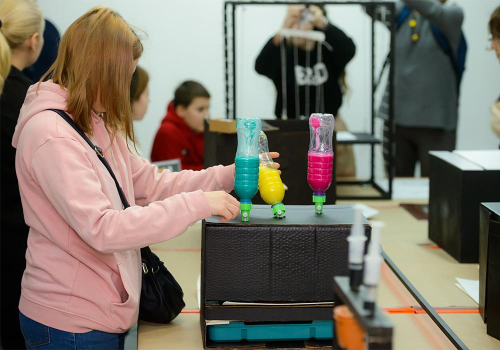 Пройдя «солнечным путем», посетители смогли ознакомиться в том числе с творческими работами обучающихся. Центральное место среди них заняли «рисовальные машины» – футуристические изобретения, которые благодаря специально продуманному механизму трансформируют механическую силу в авторский отпечаток на листе бумаги.