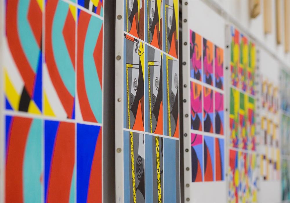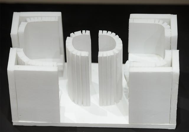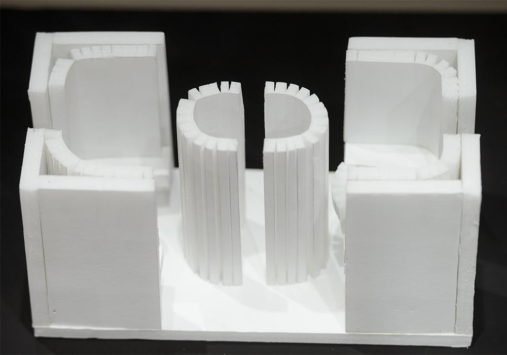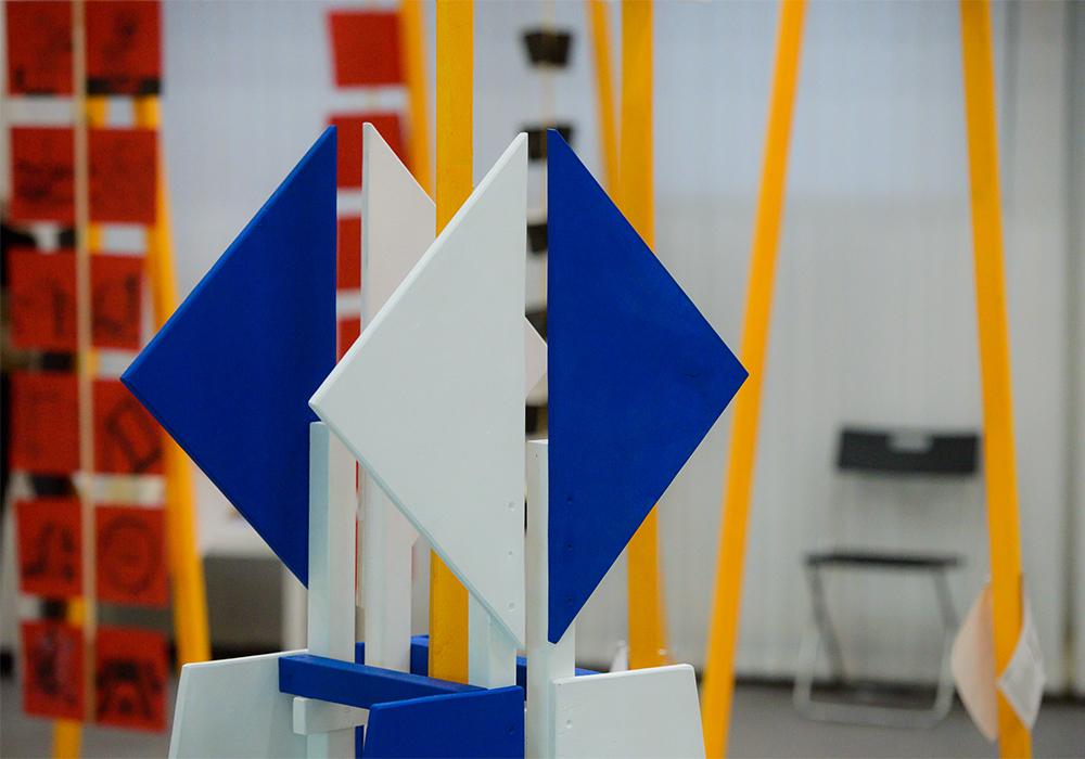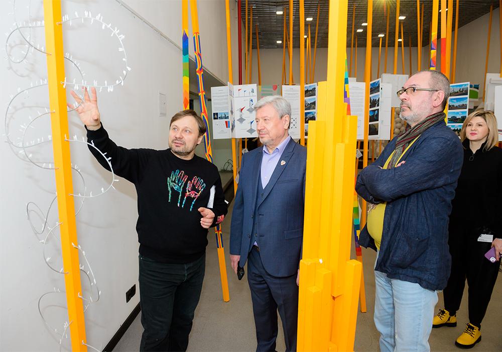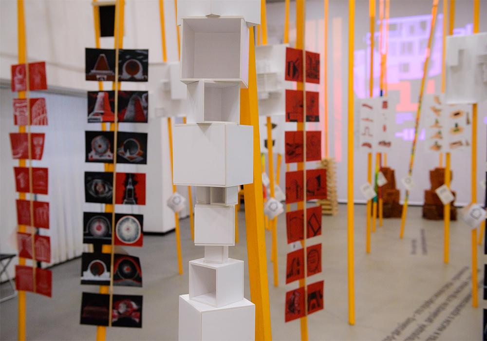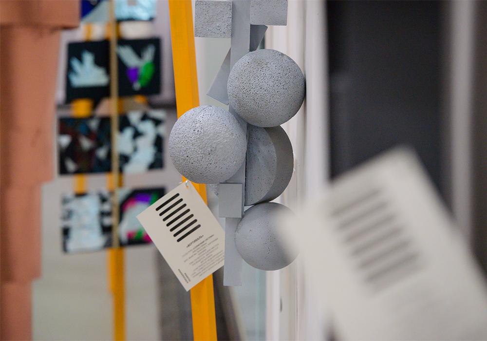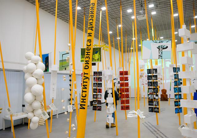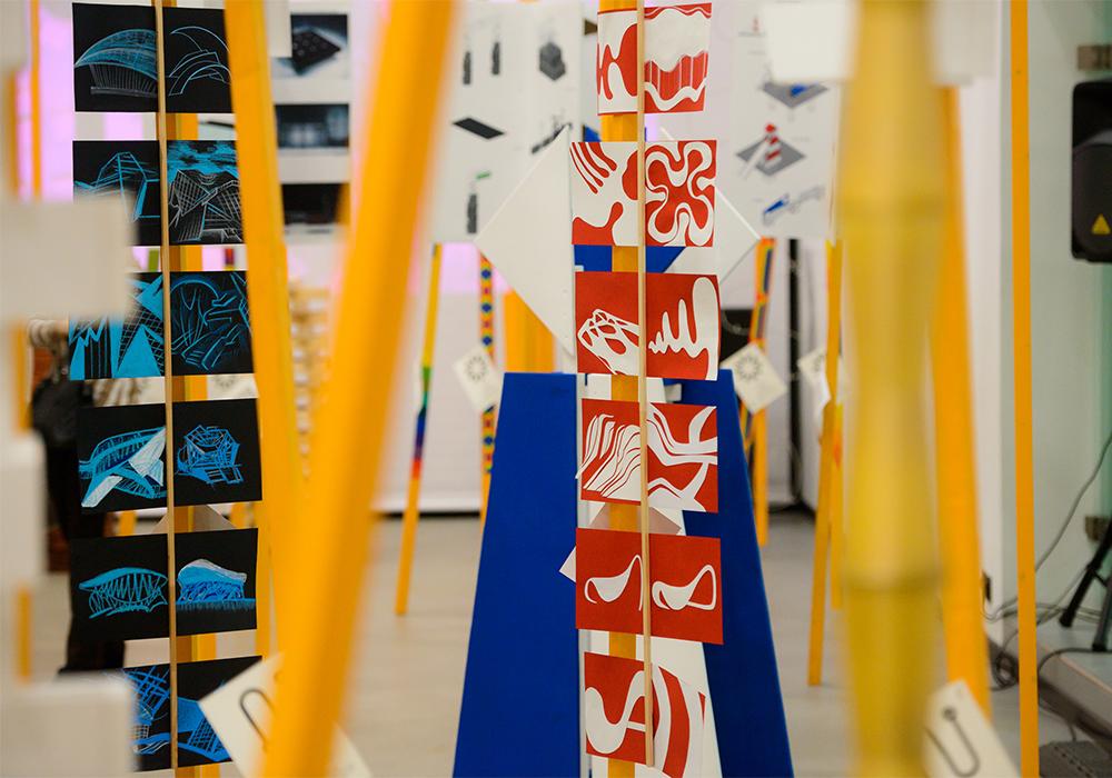 Попав в экспозиционный зал, пронизанный 5-метровыми арт-объектами в виде лучей, и перемещаясь между ними, посетители смогли погрузиться в творческую атмосферу института и проследить методику преподавания на каждом курсе и профиле, выраженную в проектах студентов: колористических и скульптурных композициях, проектах и макетах индивидуальных жилых домов, комплексах малых архитектурных форм.