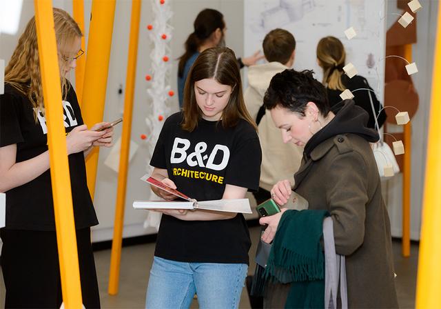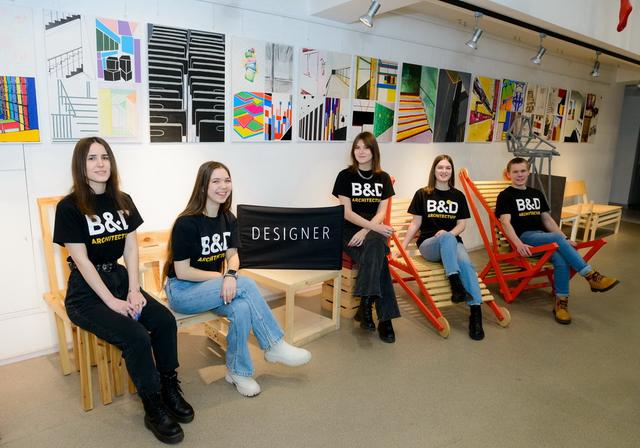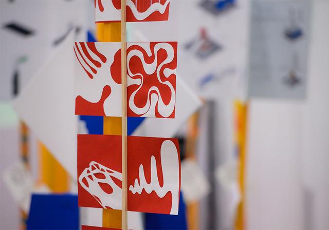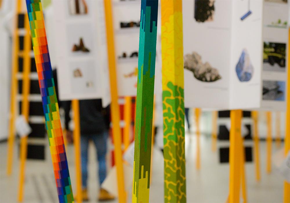 «Выставка олицетворяет те знания, которые студенты получают от педагогов: они спускают их сверху «солнечными лучами», сквозь которые проходят студенты и реализуют свои знания в проектах», – объясняет концепцию Владислав Савинкин, руководитель профиля «Архитектурная среда и дизайн».