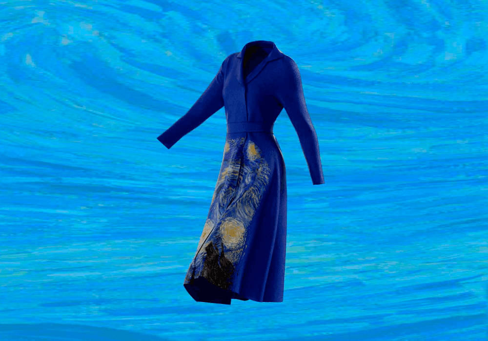 Юлия Харитонова создала динамичную 3D-модель уникального пальто с авторской росписью в стиле Ван Гога, которое специально для проекта сшила Елена Махиня – дизайнер, основательница бренда Astromoda.