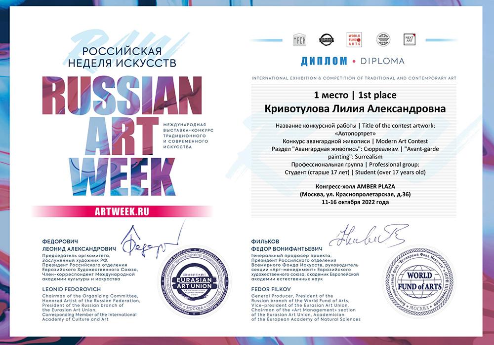 — Лилия Кривотулова заняла первое место в номинации «Абстрактная живопись: Концептуальная абстракция» с картиной «Автопортрет», а также завоевала второе место с работой Tina;