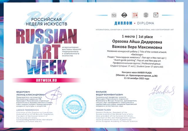 — Айша Оразова и Вера Важова заняли первое место в номинации «Авангардная живопись: Поп-арт и Нео-поп-арт» с картиной BACKSTAGE;