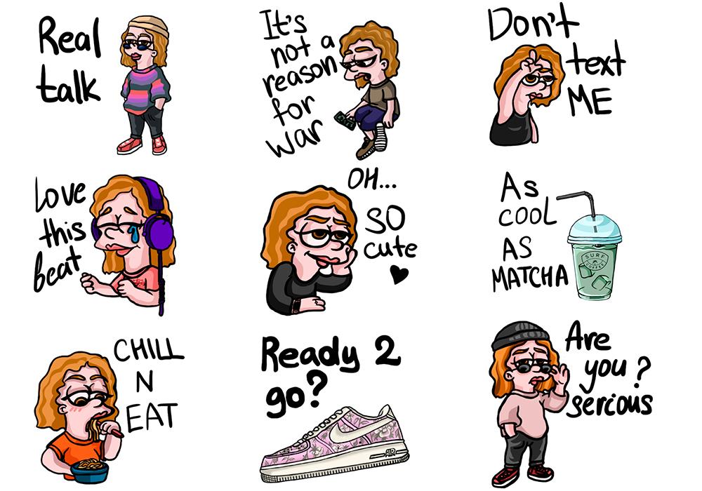 Проекты Милены Соловьевой - общественное движение, выраженное в стикерах и дизайн селфи, выполненный на основе работы с собственным лицом – просто, интересно и актуально. Амели Харрисон создала стикеры с единой эмоциональной направленностью в авторском стиле рисования.