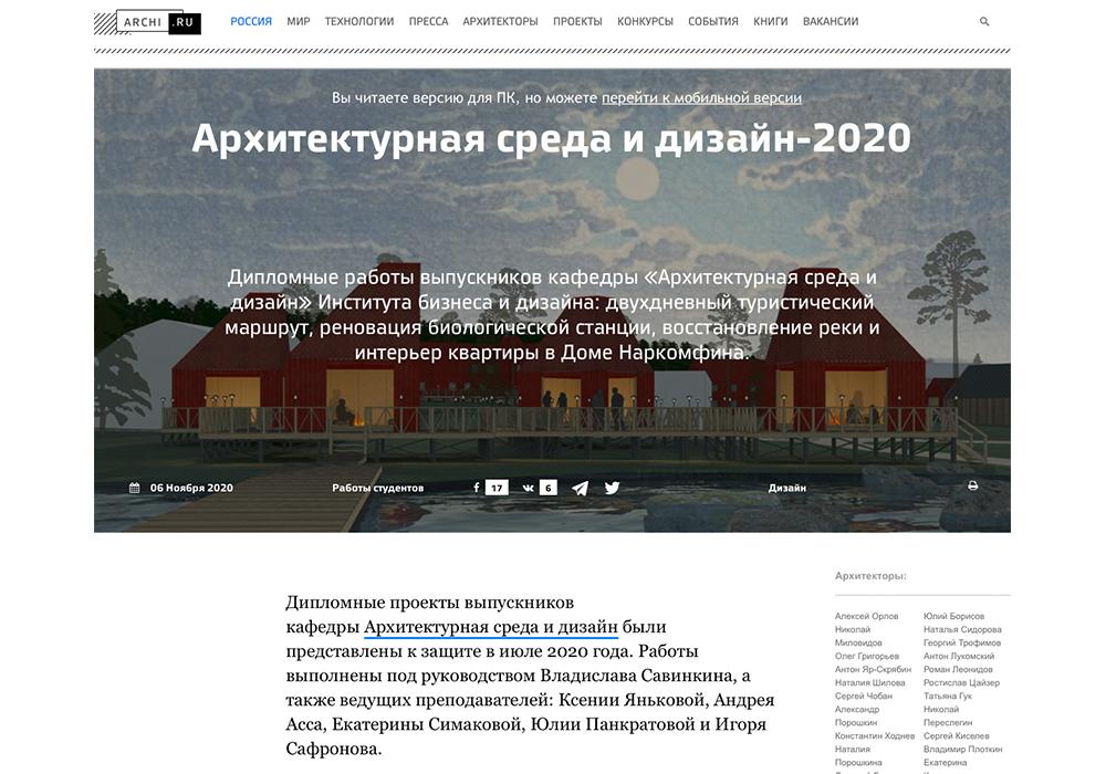 Дипломные работы выпускников 2020 года профиля «Архитектурная среда и дизайн» опубликованы ведущим архитектурным онлайн-изданием России – Archi.ru.