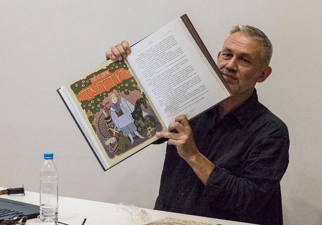 На встрече со студентами Алексей рассказал о своем творческом пути и дал советы начинающим специалистам как работать над книгой. Так, например, работая над изданием, всегда надо помнить, что текст и иллюстрация должны дополнять друг друга, а не соперничать за право первенства. К сожалению, бывают случаи, когда книгу совершенно невозможно читать из-за ярких иллюстраций, которые не позволяют «пробиться» к тексту.