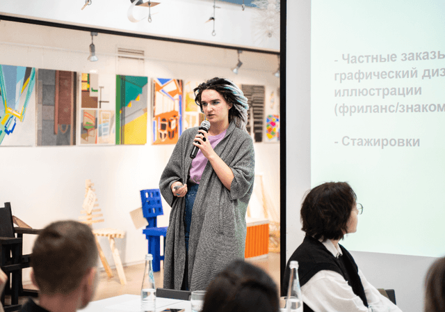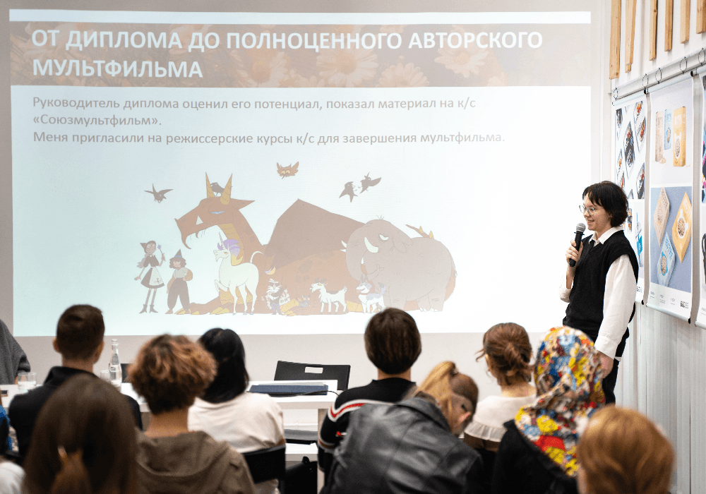 Студенты узнали, как ее дипломный проект вырос до производства и выхода на телеканале, каким образом Марии удалось получить грант от Министерства Культуры, каковы дальнейшие перспективы у ее авторского мультфильма и авторские планы в карьере режиссера аниматика.